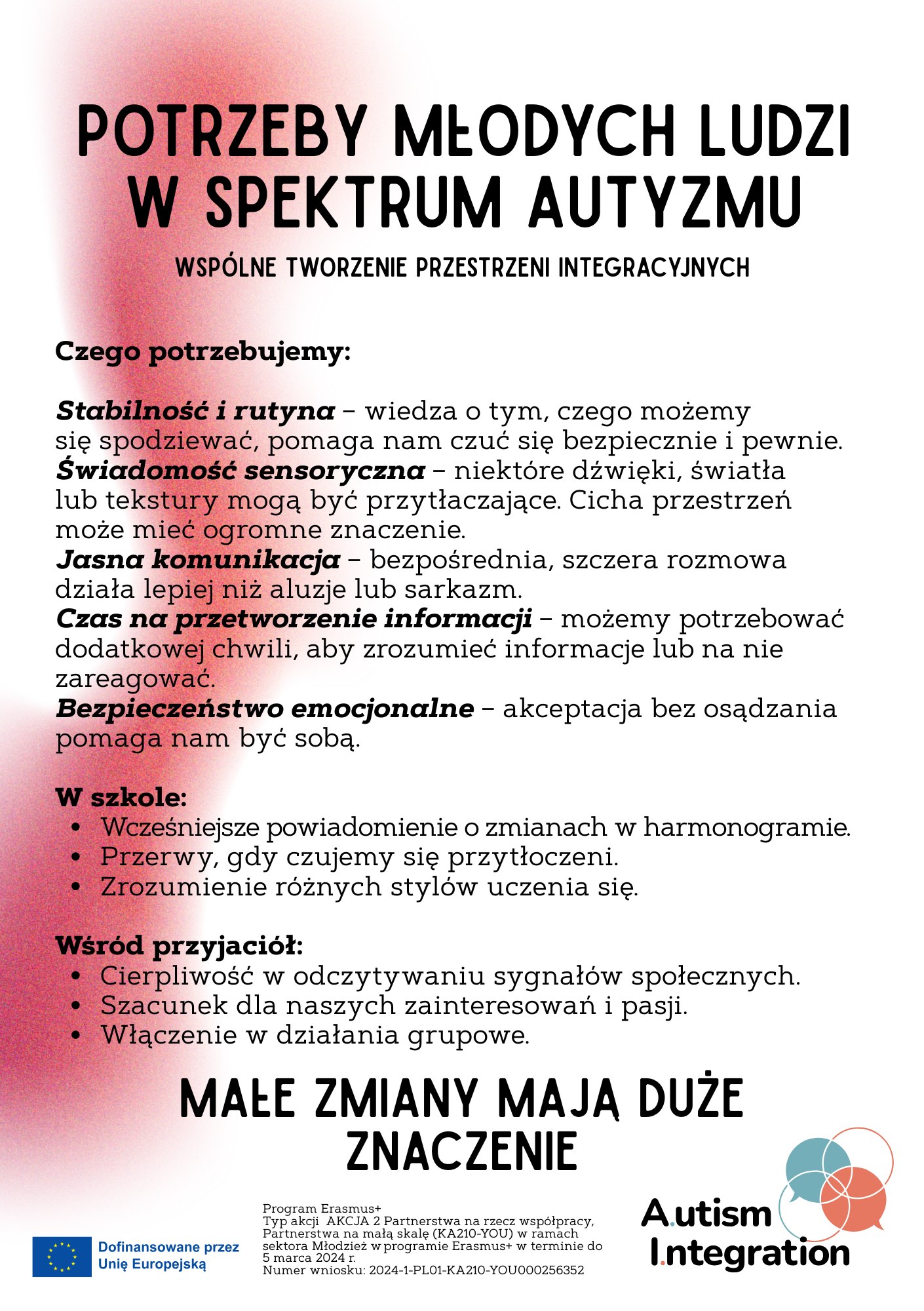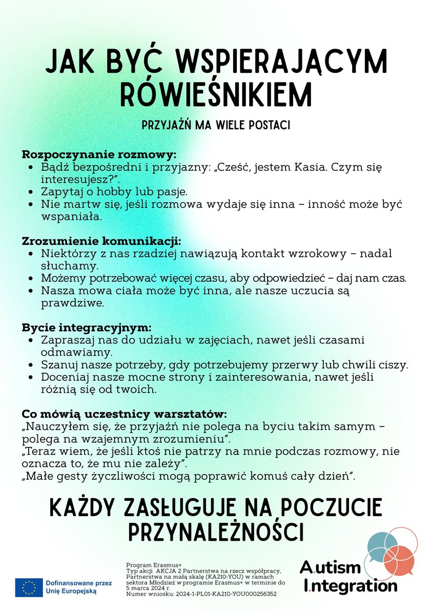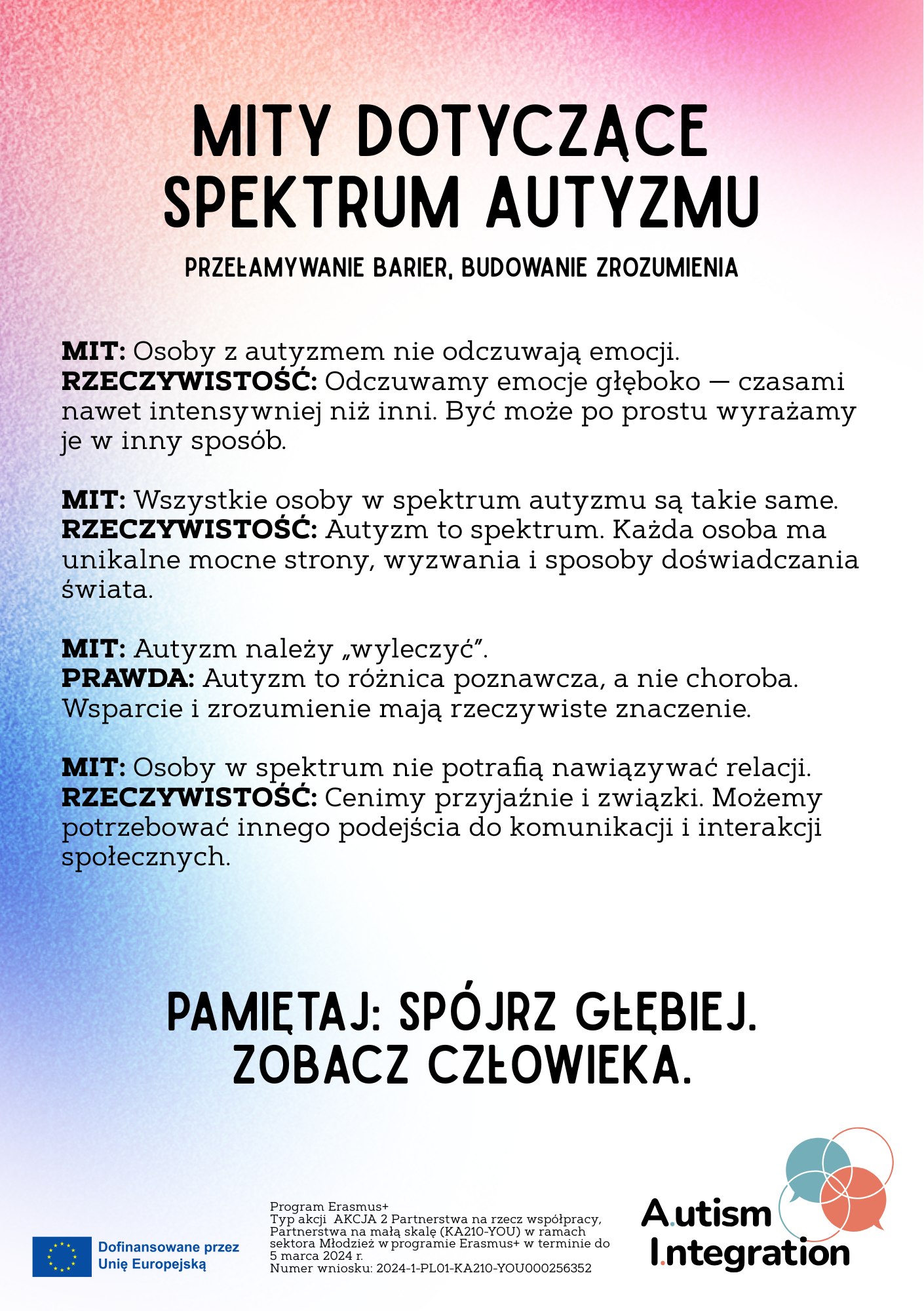 Działania są finansowane ze środków Unii Europejskiej w ramach programu Erasmus+ w projekcie „A.utism I.ntegration - opracowanie narzędzi edukacyjnych bazujących na potencjale sztucznej inteligencji wspierających integrację społeczną osób młodych z niepełnosprawnościami poznawczymi.” (2024-1-PL01-KA210-YOU-000256352).
