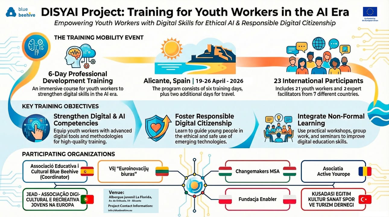 Projekt koncentruje się na wzmacnianiu kompetencji i umiejętności pracowników młodzieżowych, aby mogli oni skuteczniej wspierać młodych ludzi w rozwijaniu kompetencji cyfrowych oraz w kształtowaniu postaw odpowiedzialnego, świadomego i bezpiecznego funkcjonowania w świecie technologii cyfrowych, w tym narzędzi opartych na sztucznej inteligencji. Jednym z kluczowych założeń projektu jest kompleksowe przygotowanie pracowników młodzieżowych do prowadzenia działań edukacyjnych, które uzupełniają formalną edukację szkolną o wysokiej jakości edukację pozaformalną. Uczestnicy projektu zdobędą zarówno wiedzę techniczną, jak i kompetencje pedagogiczne, niezbędne do pracy z młodymi ludźmi w dynamicznie zmieniającym się środowisku cyfrowym. Projekt stawia sobie za cel m.in. rozwój kompetencji cyfrowych pracowników młodzieżowych, wyposażenie ich w nowoczesne narzędzia i metody pracy, a także wzmocnienie ich roli jako mentorów i przewodników w cyfrowym świecie. Szczególny nacisk położony zostanie na wspieranie krytycznego myślenia, etycznego korzystania z technologii oraz budowanie odpowiedzialnego podejścia do sztucznej inteligencji wśród młodych ludzi. Dzięki udziałowi w projekcie pracownicy młodzieżowi będą przygotowani do projektowania i wdrażania programów edukacyjnych dostosowanych do wieku, potrzeb i zainteresowań uczestników, tworzenia bezpiecznych przestrzeni do pracy grupowej, udzielania indywidualnego wsparcia oraz oceny skuteczności prowadzonych działań. Istotnym elementem projektu jest także podkreślenie, że narzędzia cyfrowe i aplikacje oparte na AI powinny być zawsze dobierane elastycznie, z uwzględnieniem kontekstu, grupy docelowej i celów edukacyjnych. Cieszymy się, że możemy być częścią inicjatywy, która realnie wzmacnia kompetencje osób pracujących z młodzieżą i przyczynia się do budowania pokolenia świadomych, odpowiedzialnych i kompetentnych cyfrowo młodych ludzi. To dla nas ważny krok w dalszym rozwoju działań edukacyjnych i międzynarodowej współpracy. Mobilność już w kwietniu 2026! W projekcie biorą udział partnerzy z 7 krajów: