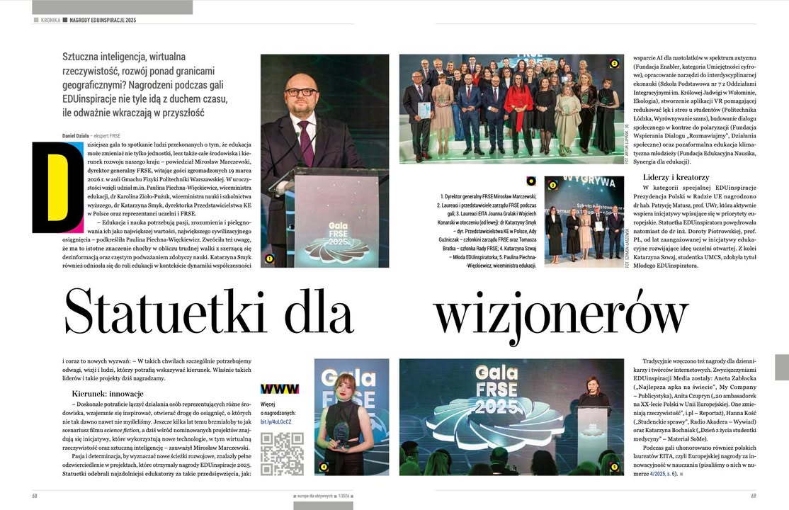 O zeszłotygodniowej Gali EduInspiracje Fundacja Rozwoju Systemu Edukacji przeczytać można w najnowszym numerze kwartalnika Europa dla Aktywnych 1/2026. Byliśmy na niej i my – odebrać nagrodzę w Kategorii Umiejętności Cyfrowe za realizację projektu „A.utism I.ntegration - opracowanie narzędzi edukacyjnych bazujących na potencjale sztucznej inteligencji wspierających integrację społeczną osób młodych z niepełnosprawnościami poznawczymi.” (2024-1-PL01-KA210-YOU-000256352).