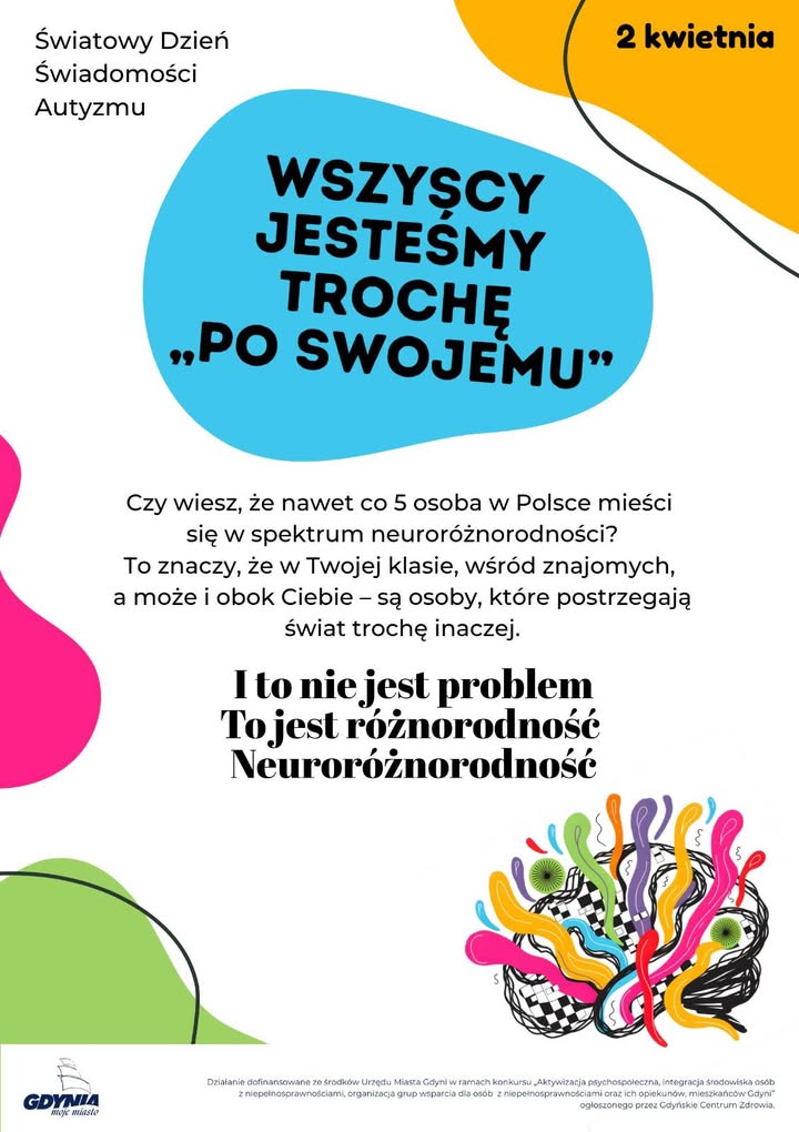 W marcu i kwietniu realizujemy w Gdyni projekt „A.utism I.ntegration – działania edukacyjne w gdyńskich szkołach ponadpodstawowych bazujące na potencjale sztucznej inteligencji wspierające integrację społeczną osób młodych z niepełnosprawnościami poznawczymi” w ramach konkursu „Aktywizacja psychospołeczna, integracja środowiska osób z niepełnosprawnościami, organizacja grup wsparcia dla osób z niepełnosprawnościami oraz ich opiekunów, mieszkańców Gdyni” ogłoszonego przez Gdyńskie Centrum Zdrowia. Za nami warsztaty w szkołach, a od przyszłego tygodnia ruszamy z kampanią społeczną – Każdy jest trochę „po swojemu”. Gdyńskie Centrum Zdrowia