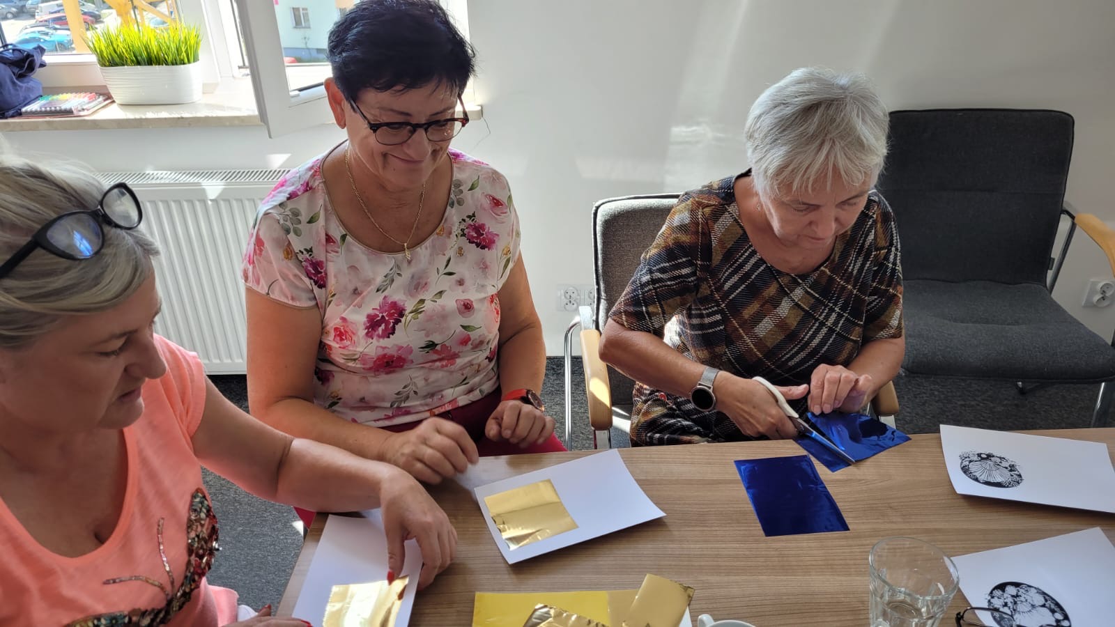 W wakacyjne weekendy spotykamy się z gdyńskimi Seniorkami na marynistycznych warsztatach. Panie w licznym gronie poznają nowe techniki artystyczne. Po linorycie i cyjanotypii przyszedł czas na embossing i złocenie - oczywiście pozostajemy w klimacie marynistycznym.
