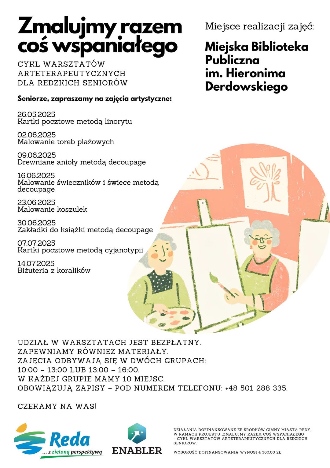 Z nieskrywaną radością ruszamy z realizacją projektu „Zmalujmy razem coś wspaniałego – cykl warsztatów arteterapeutycznych dla redzkich seniorów”.